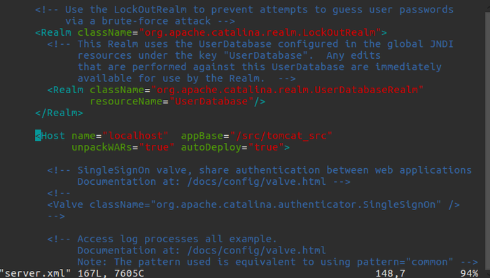 在/tomcat/conf/下 vim server.xml 把原本的 appBase=”webapps” ,修改成你要设置的目录 如下
